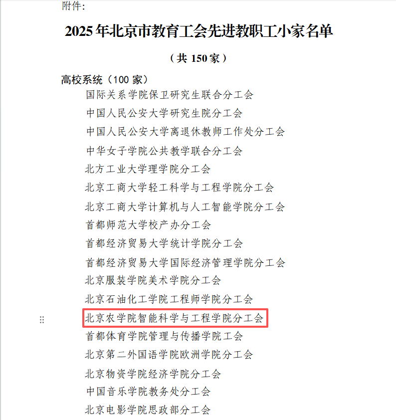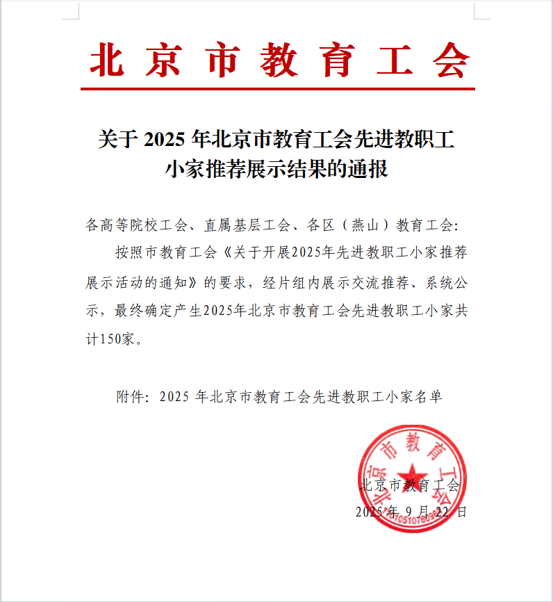 近日,从北京市教育工会传来喜讯:经过片组展示交流推荐、系统公示等评审环节,我院分工会成功获评“2025年北京市教育工会先进教职工小家”。